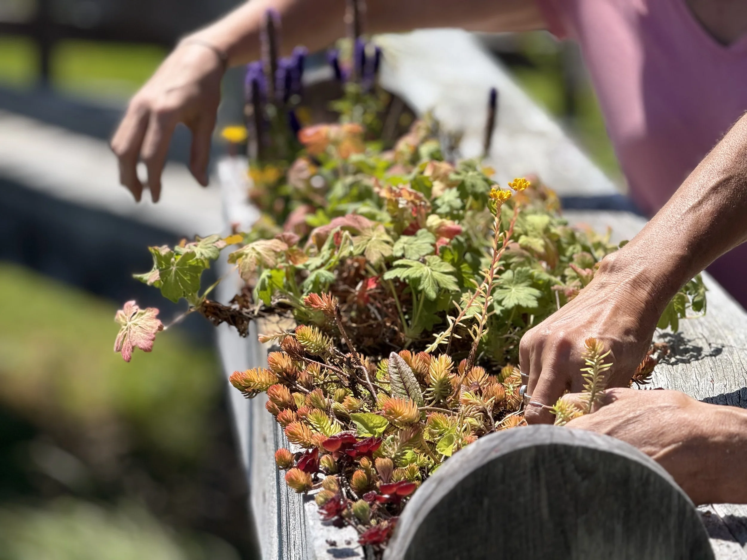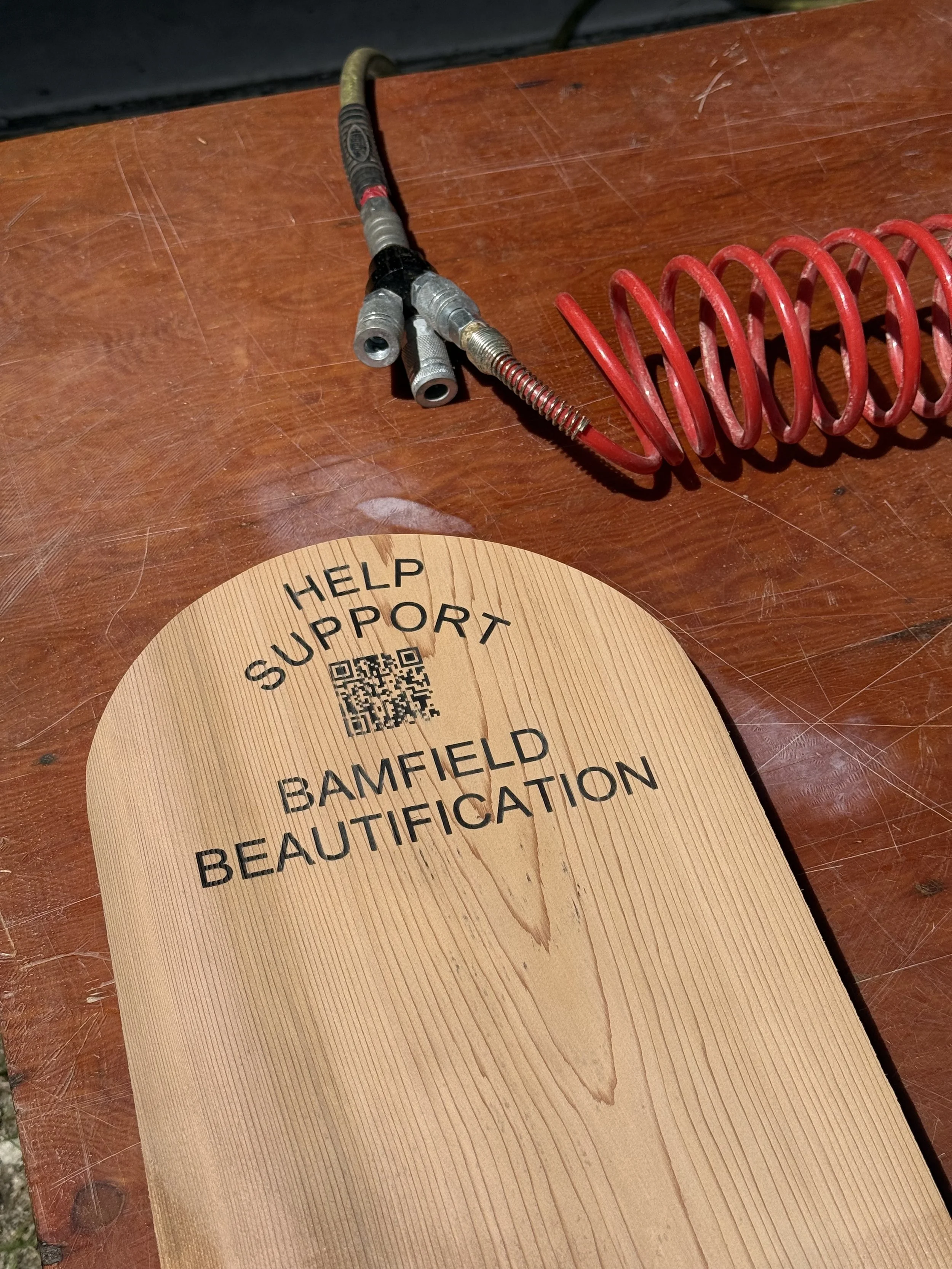 The flower boxes are made by local Bamfielders and use local sustainably-harvested. Cedar is used as the natural oils and acids help provide longevity to the boxes.