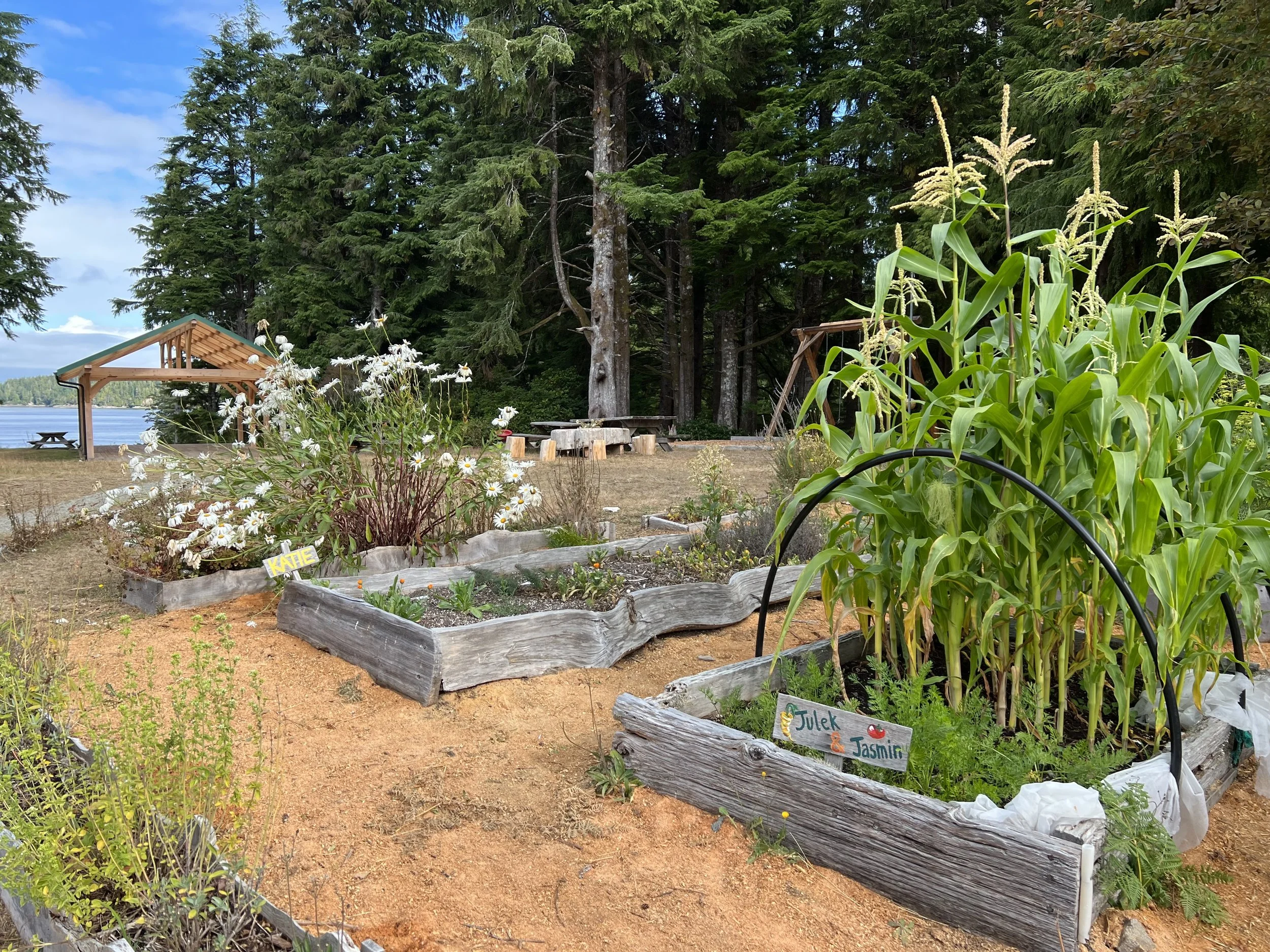 Community-maintained garden beds feature a range of crops and flowers. A nearby shed built by volunteers houses shared equipment to help with maintenance.